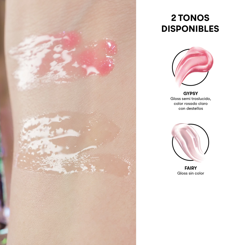 Gypsy (re stock) Gloss semi traslúcido color rosado con destellos. Brinda una apariencia de labios voluminosos con un toque de color.