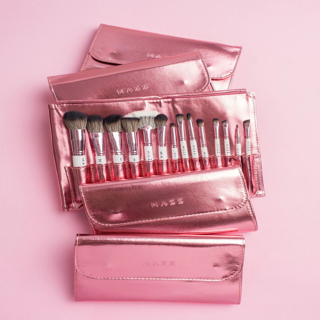 Estuche de Brochas y Pinceles: Estuche para brochas y pinceles de color rosa metal de material sintético. Cuenta con 8 compartimentos para pinceles y 6 compartimentos para brochas. Cierre imantado.